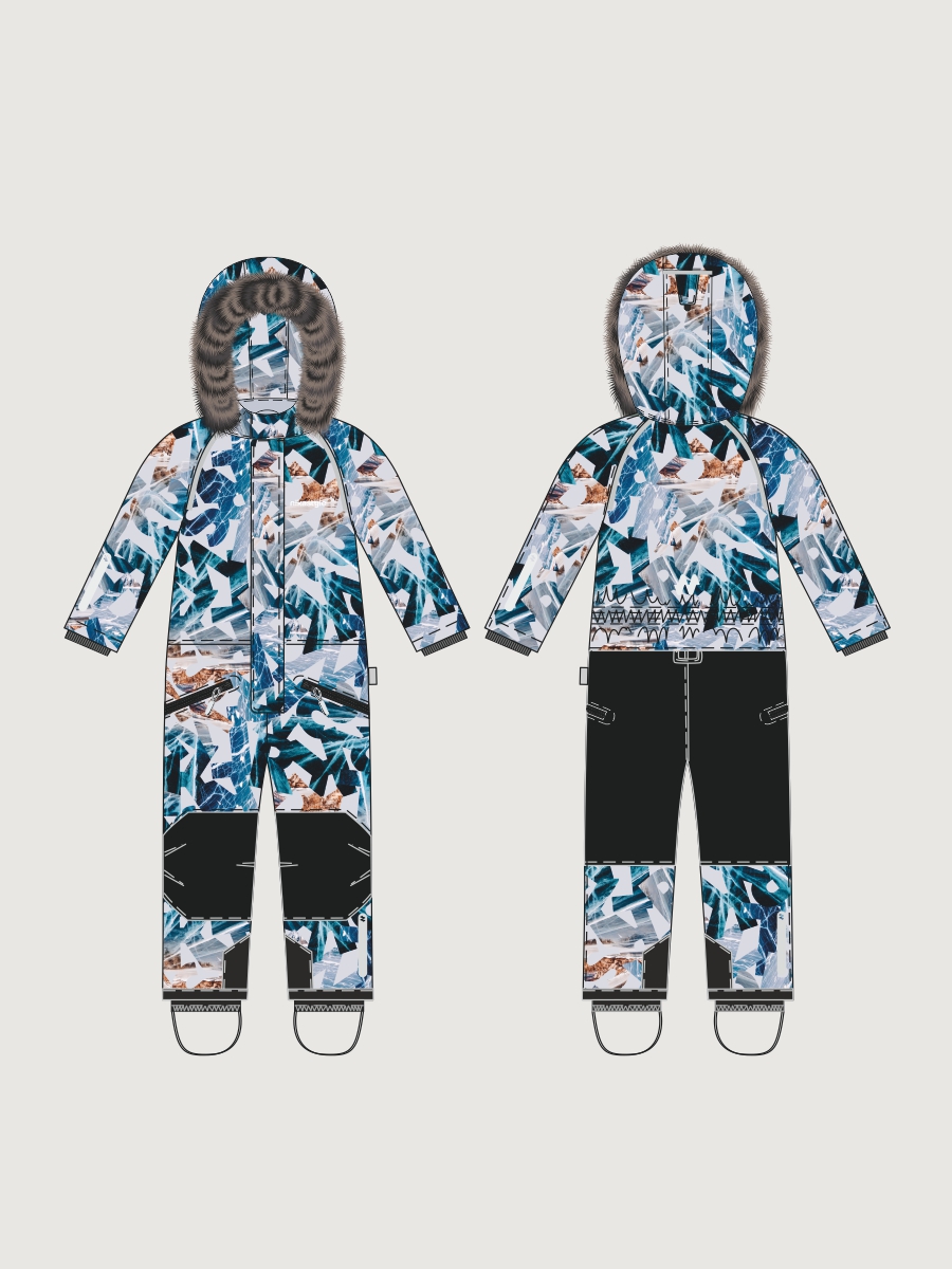 Функционал: центральная застежка и карманы на молнии, ветрозащитная планка, съемный капюшон и меховая опушка на молнии, кулиса для регулировки объема, резинка на спинке для создания силуэта, внутренние бретели для возможности снять верхнюю часть изделия в помещении. Мы все продумали до мелочей, поэтому модель дополнительно оснащена мягкими трикотажными манжетами в рукавах, флисовая подкладка до середины бедра, область колен и шов сидения проклеены, места повышенного трения выполнены из усиленной ткани, снегозащитные муфты на брючинах, силиконовые штрипки, светоотражающие элементы для безопасности ребенка в темное время суток.