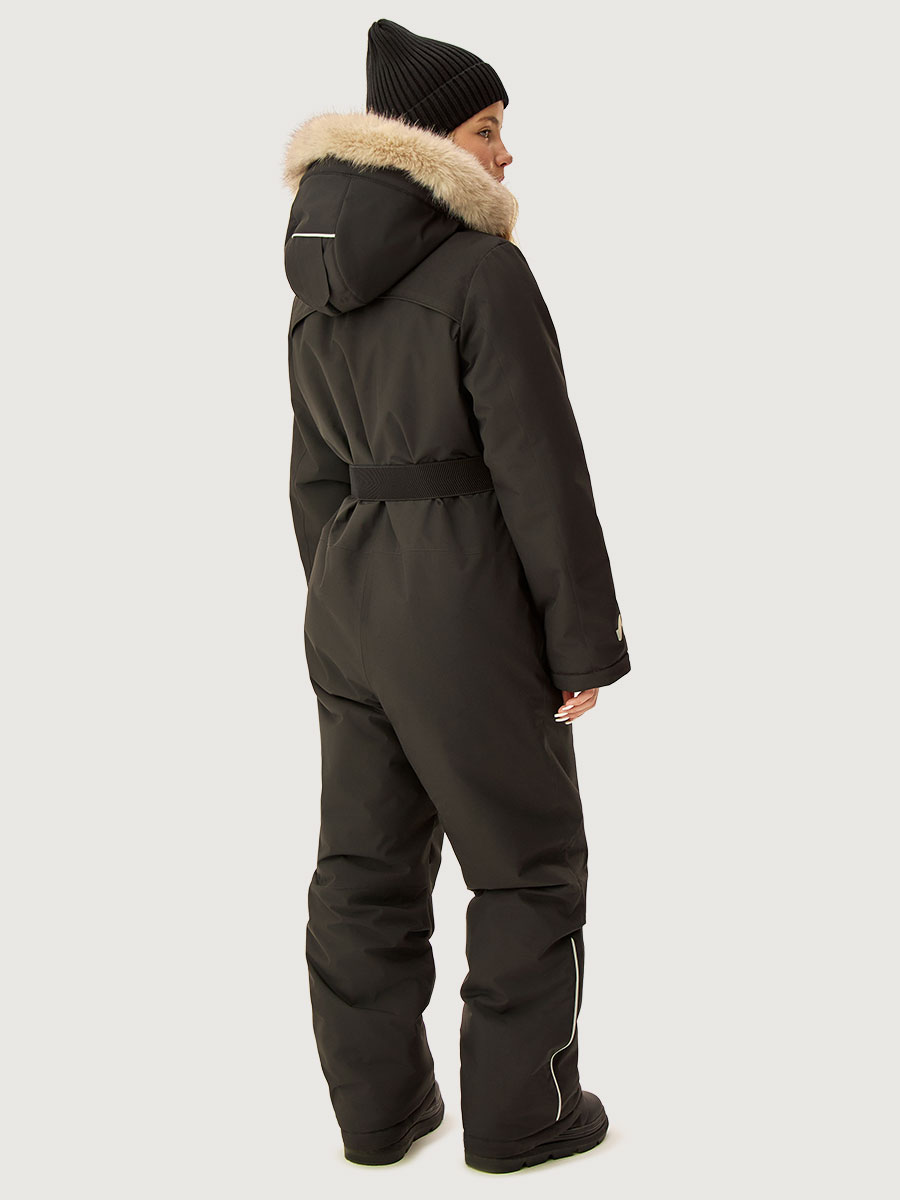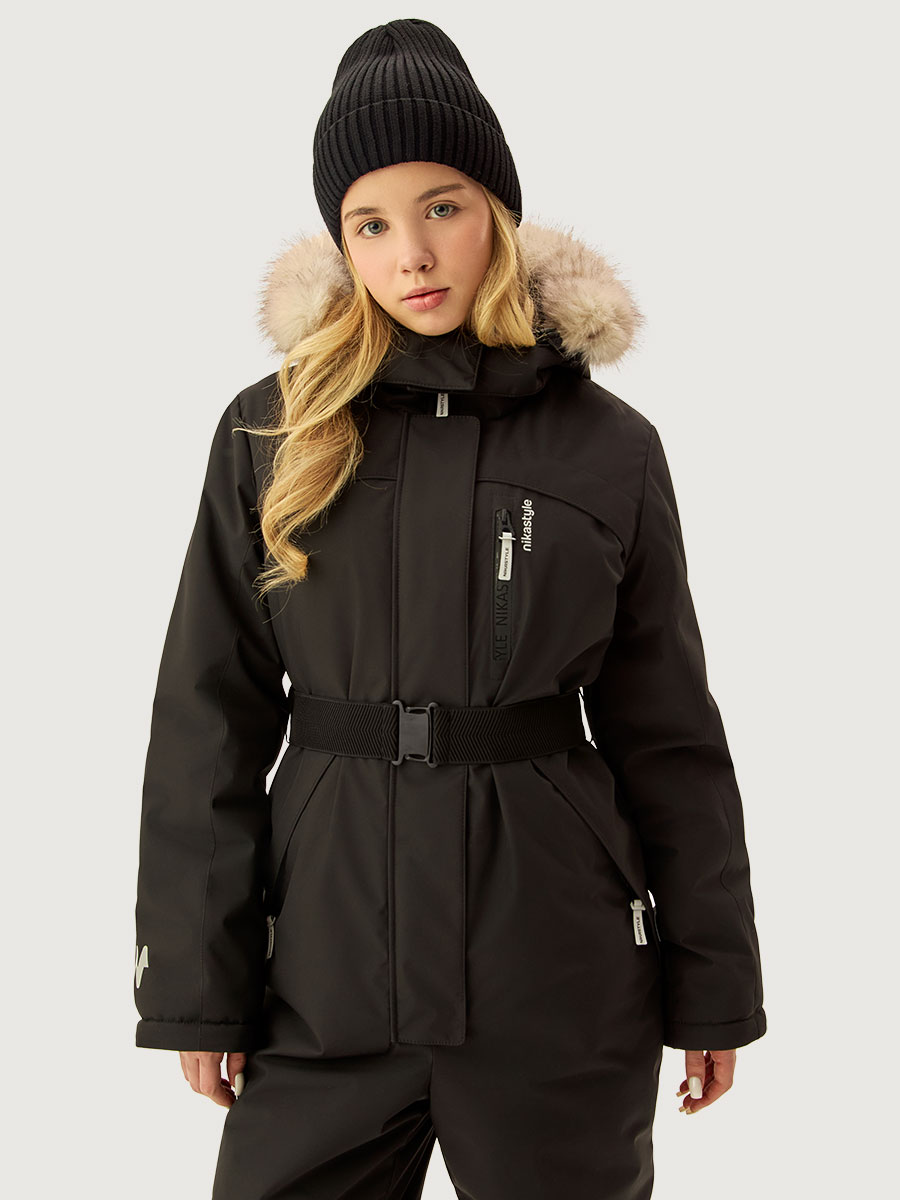 Функционал: центральная застежка и карманы на молнии, внутренний карман на молнии, ветрозащитная планка, съемный капюшон и меховая опушка на молнии, кулиса для регулировки объема по капюшону, съемный пояс-резинка, внутренние бретели для возможности снять верхнюю часть изделия в помещении.