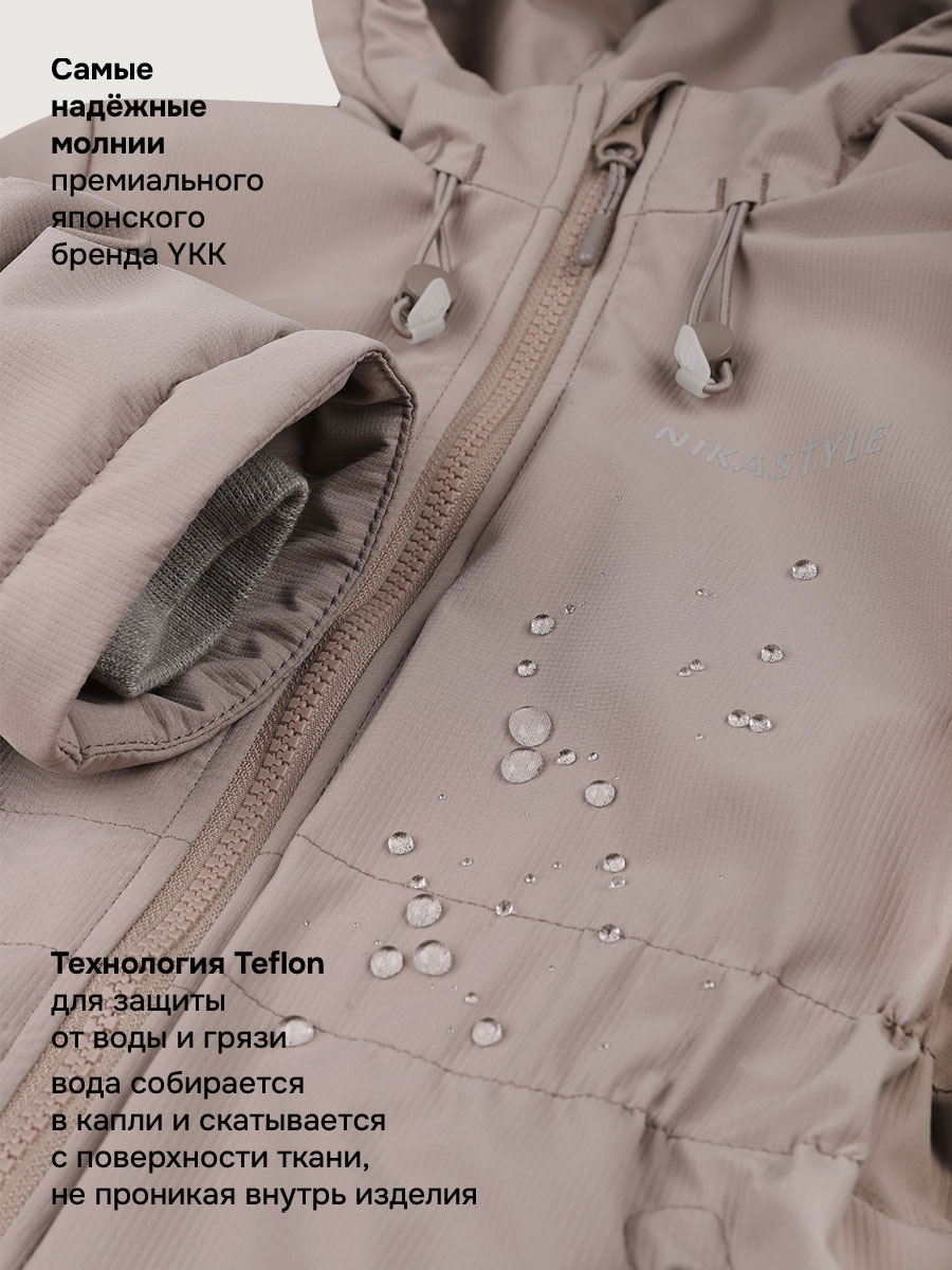 Ткань обработана снаружи экологически чистым протектором TEFLON для защиты от воды и грязи. Мембрана в сочетании с утеплителем нового поколения FIBERlite сохраняет тепло во время прогулок, позволяя телу дышать. Флисовая подкладка отводит влагу и имеет хорошие теплоизоляционные свойства.