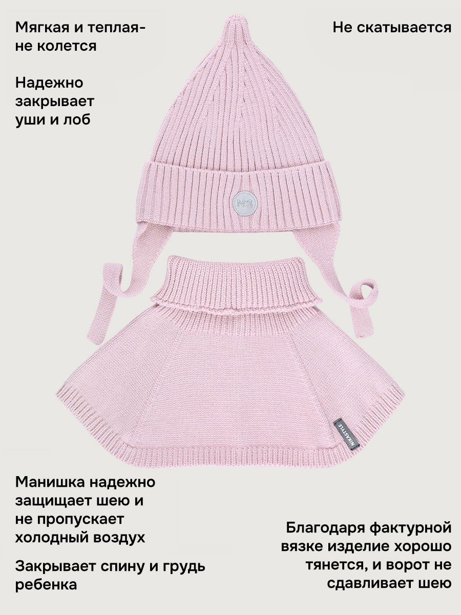 Комплект КОСМОС из шапки и манишки незаменимая вещь в гардеробе ребенка. Шапка на хлопковой подкладке, с отворотом. Манишка плотно прилегает к горлу ребенка. Отличный крой и способ вязки обеспечивает идеальную посадку.