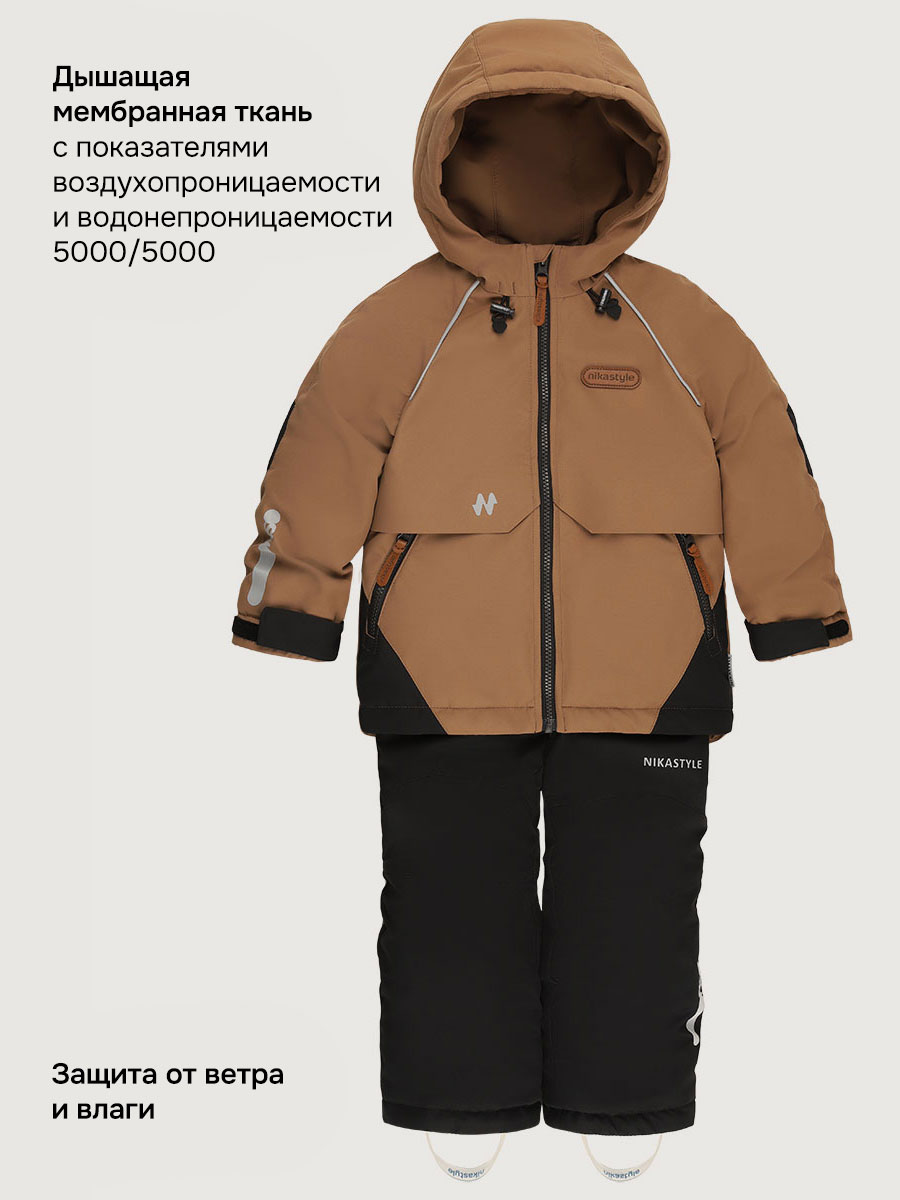 Мембранная ткань - это непродуваемый и водонепроницаемый материал, который надежно защищает от ветра и влаги. Благодаря дышащим свойствам мембраны ребенку будет комфортно в любую погоду и он не вспотеет. Ткань обработана снаружи экологически чистым протектором TEFLON для защиты от воды и грязи.
