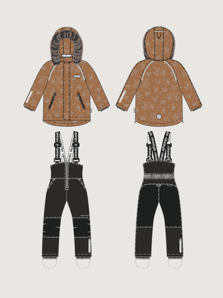Мембранная ткань это не продуваемый и водонепроницаемый материал, который надежно защищает от ветра и влаги. Благодаря дышащим свойствам мембраны ребенку будет комфортно в любую погоду и он не вспотеет. Дополнительно на ткань нанесен светоотражающий принт. Ткань обработана снаружи экологически чистым протектором TEFLON для защиты от воды и грязи. Дополнительно на ткань нанесен светоотражающий принт.