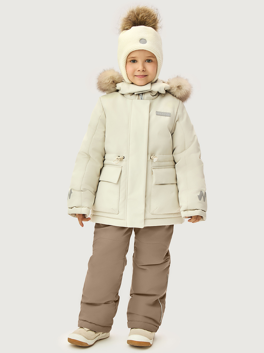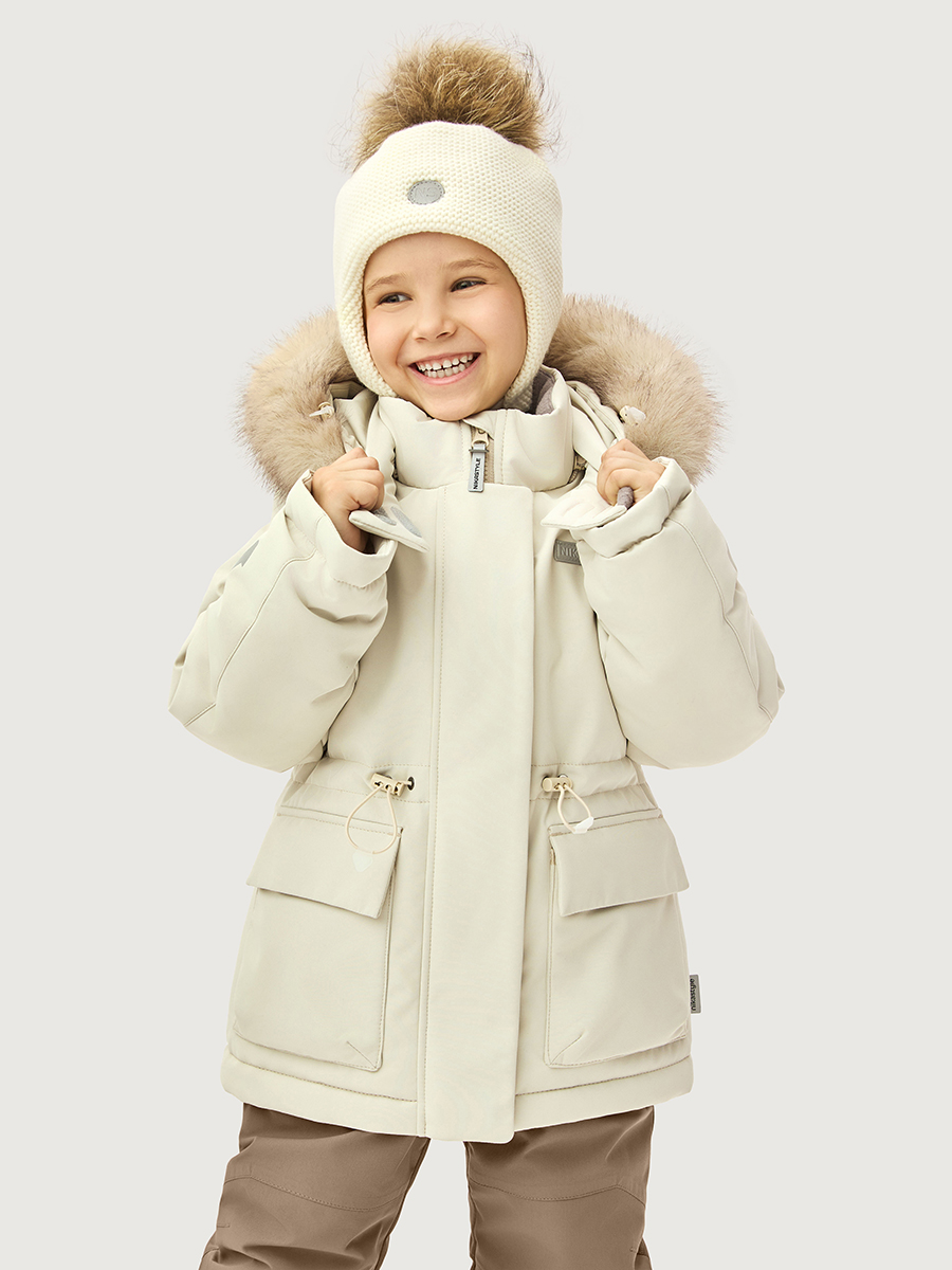 Функционал: центральная застежка на молнии, ветрозащитная планка, накладные карманы с клапаном на магнитных кнопках, съемный капюшон и меховая опушка на молнии, кулиса для регулировки объема по капюшону и по талии, мягкие трикотажные манжеты в рукавах, внутренние бретели для возможности снять куртку в помещении.