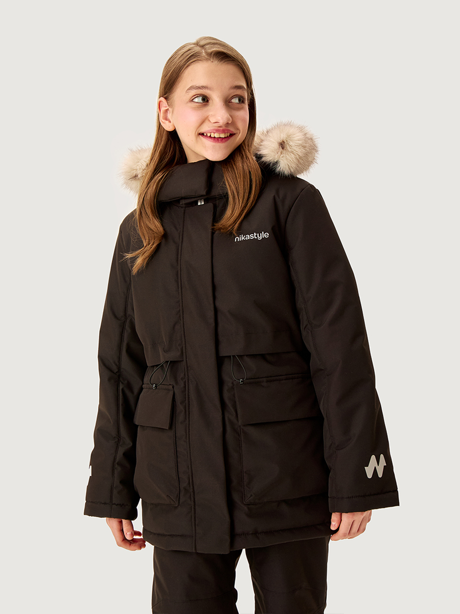 Функционал: центральная застежка на молнии, накладные карманы с клапанами на магнитных кнопках, внутренний карман на молнии, ветрозащитная планка, съемный капюшон и меховая опушка на молнии, кулиса для регулировки объема по капюшону и по талии, мягкие трикотажные манжеты в рукавах, внутренние бретели для возможности снять куртку в помещении.