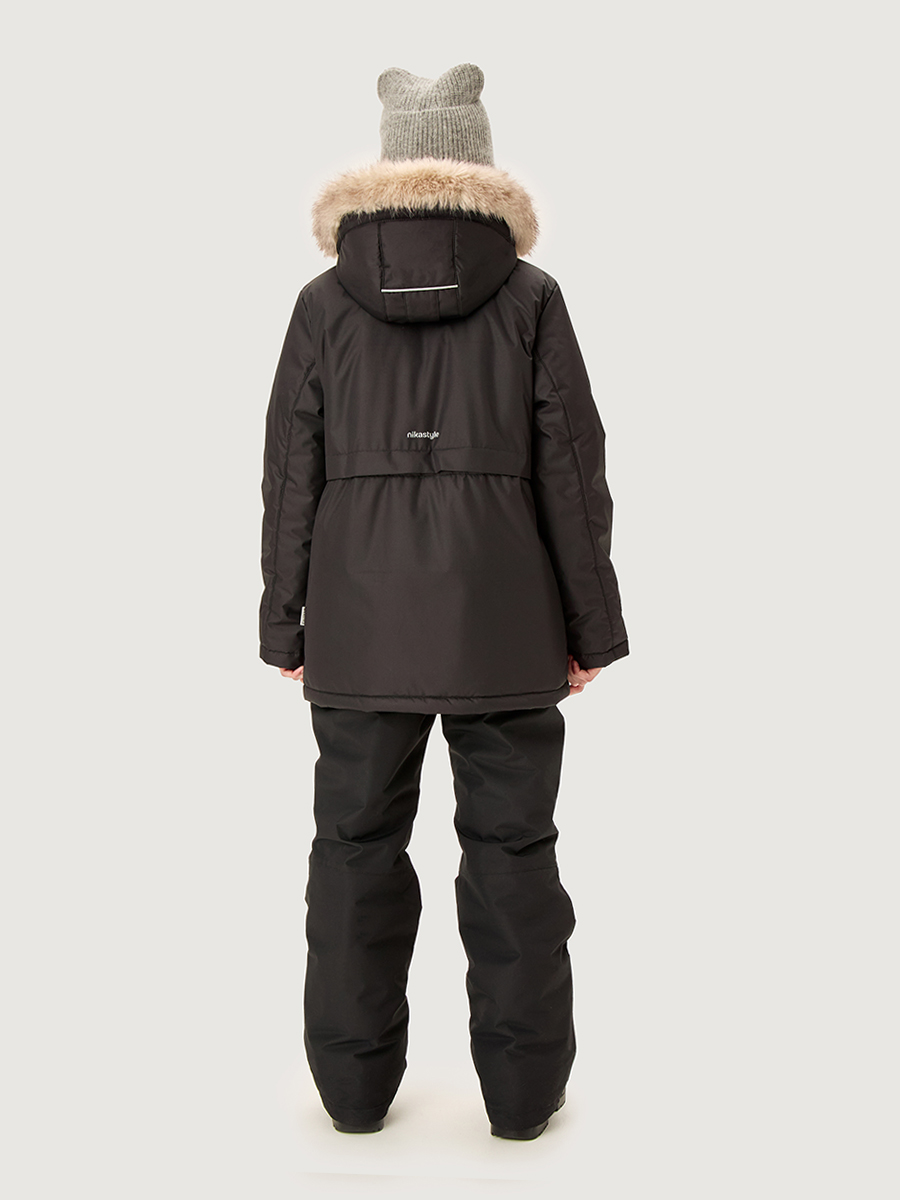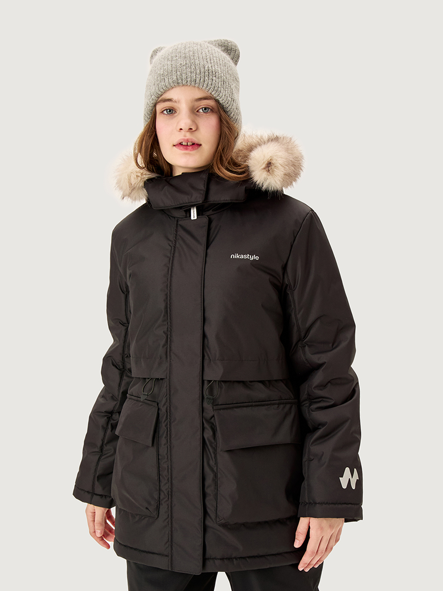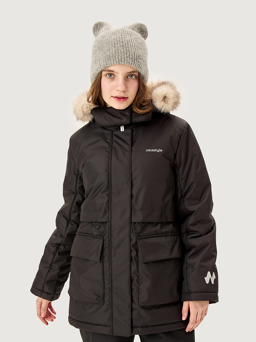 Функционал: центральная застежка на молнии, накладные карманы с клапанами на магнитных кнопках, внутренний карман на молнии, ветрозащитная планка, съемный капюшон и меховая опушка на молнии, кулиса для регулировки объема по капюшону и по талии, мягкие трикотажные манжеты в рукавах, внутренние бретели для возможности снять куртку в помещении.
