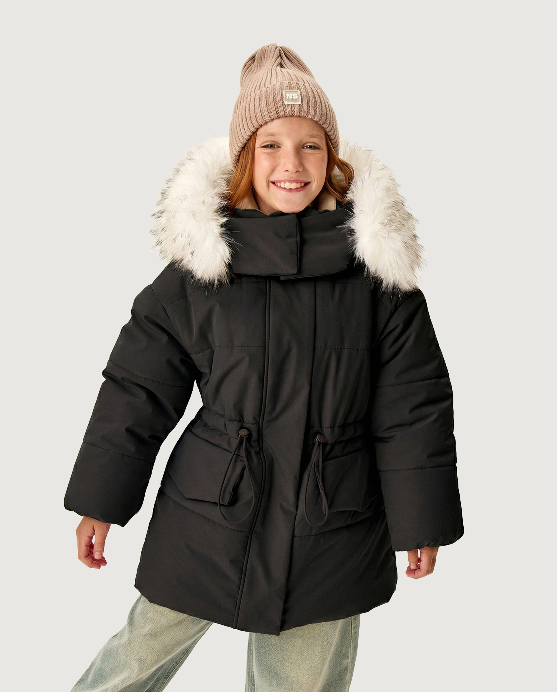 Функционал: центральная застежка на молнии, внутренний карман на молнии, карманы с клапанами на магнитных кнопках, ветрозащитная планка на кнопках, съемный капюшон на молнии, съемная меховая опушка на кнопках, кулиса для регулировки объема по капюшону и по талии, эластичная резинка по низу рукава.