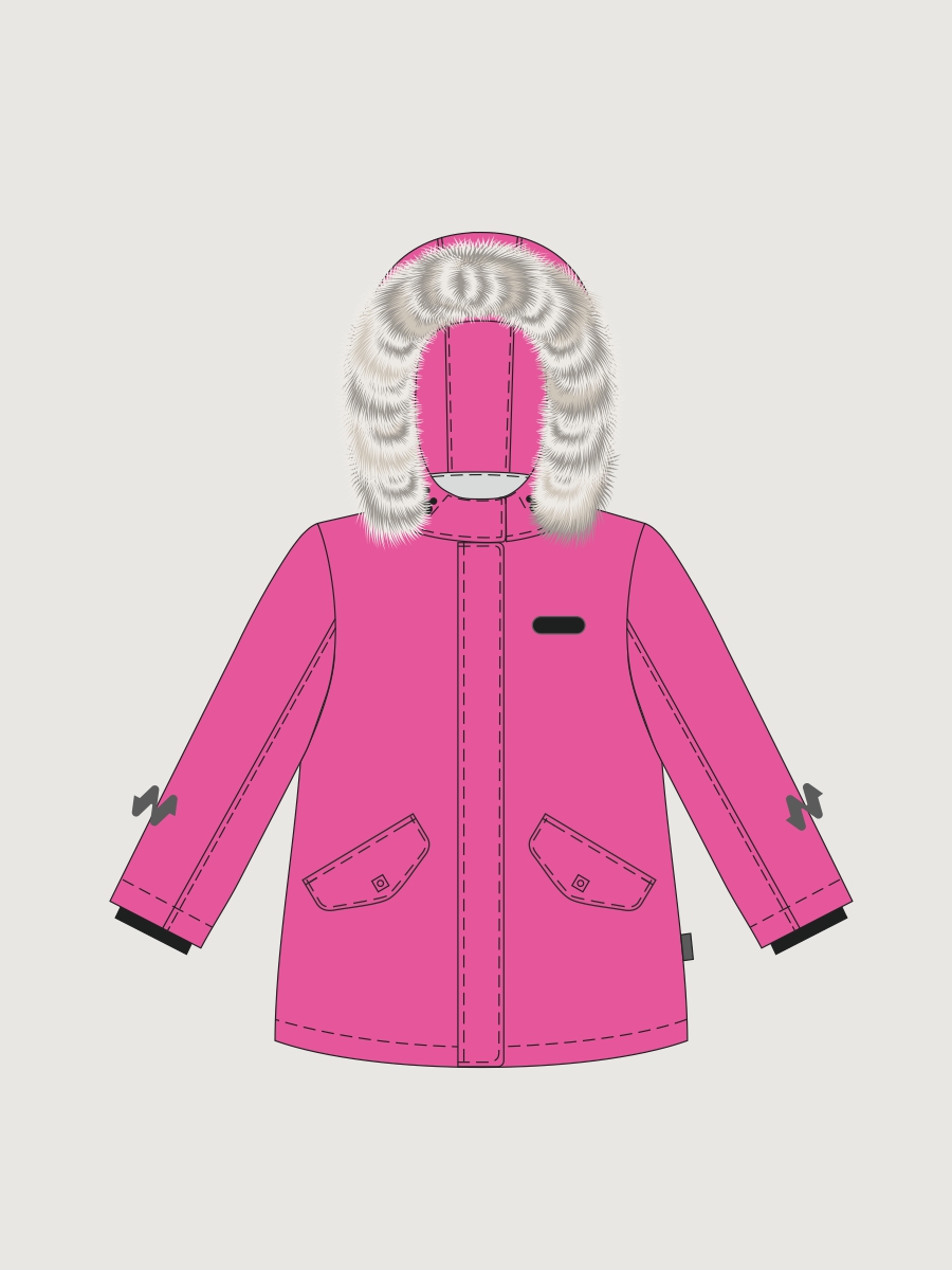 Функционал: центральная застежка на молнии, прорезные карманы с клапанами на магнитных кнопках, ветрозащитная планка, съемный капюшон и меховая опушка на молнии, кулиса для регулировки объема по капюшону и по линии талии на спинке.