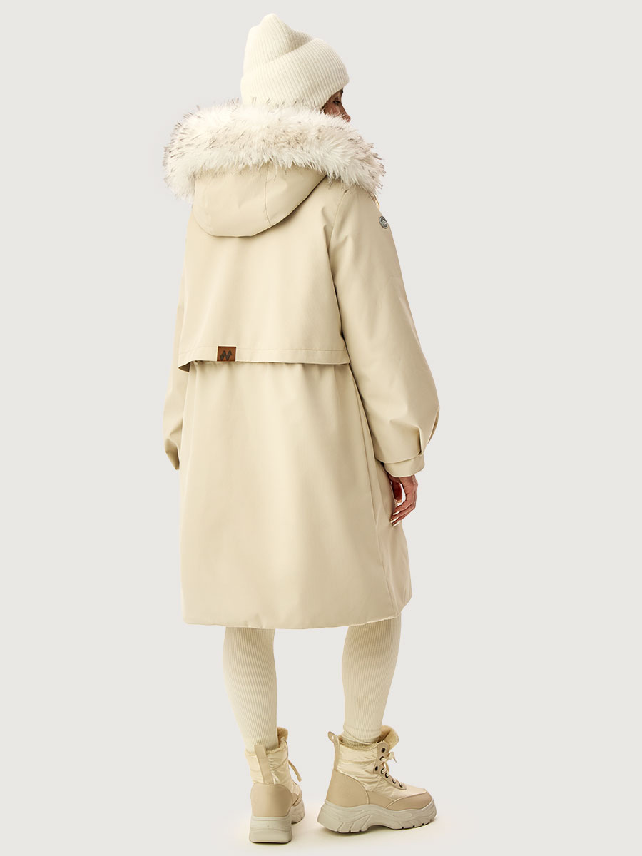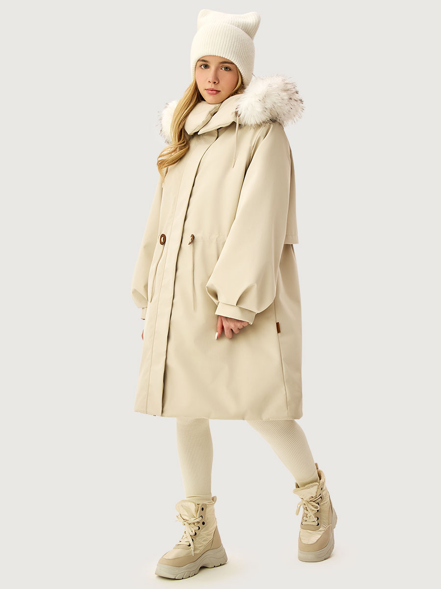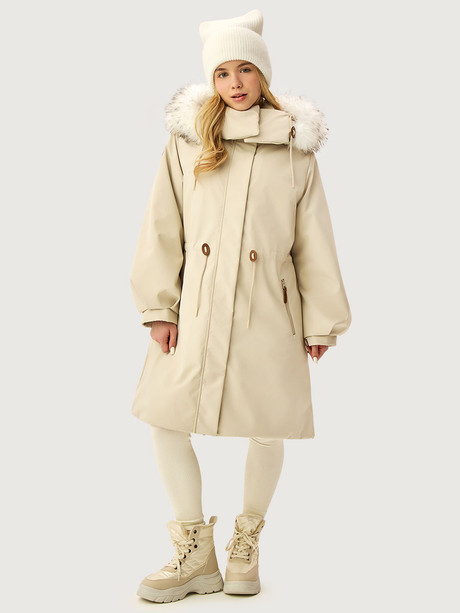 Функционал: центральная застежка и карманы на молнии, ветрозащитная планка, внутренний карман на молнии, съемный капюшон на молнии, съемная меховая опушка на кнопках, кулиса для регулировки объема по капюшону и по талии, манжеты по низу рукава.