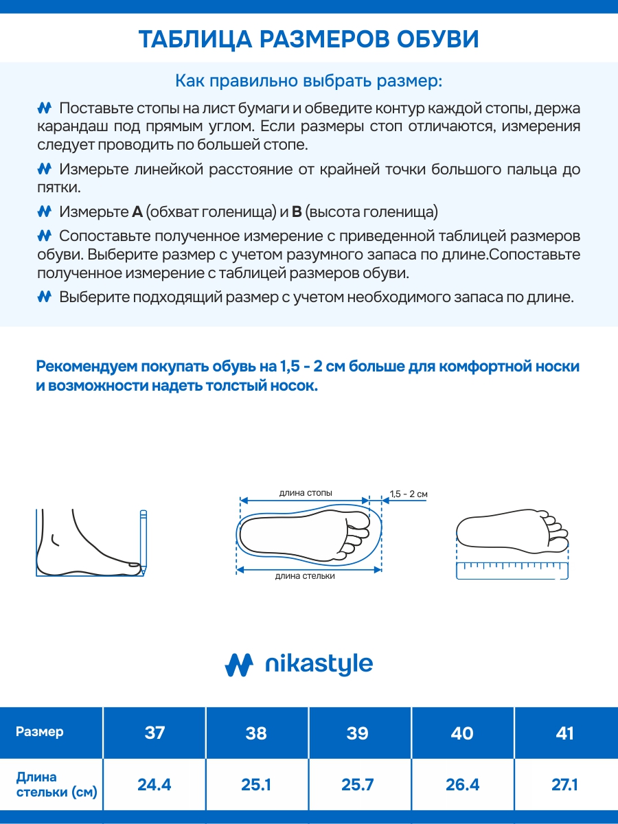 Ботинки оснащены съемной стелькой со специальной маркировкой, позволяющей правильно подобрать размер. Рекомендуем вынуть стельку и приложить к ней ногу ребенка - пальцы должны располагаться в обозначенной для этого области. При выборе обуви для ребенка, длина стельки должна быть примерно на 1-1,5 см больше, чем длина стопы.