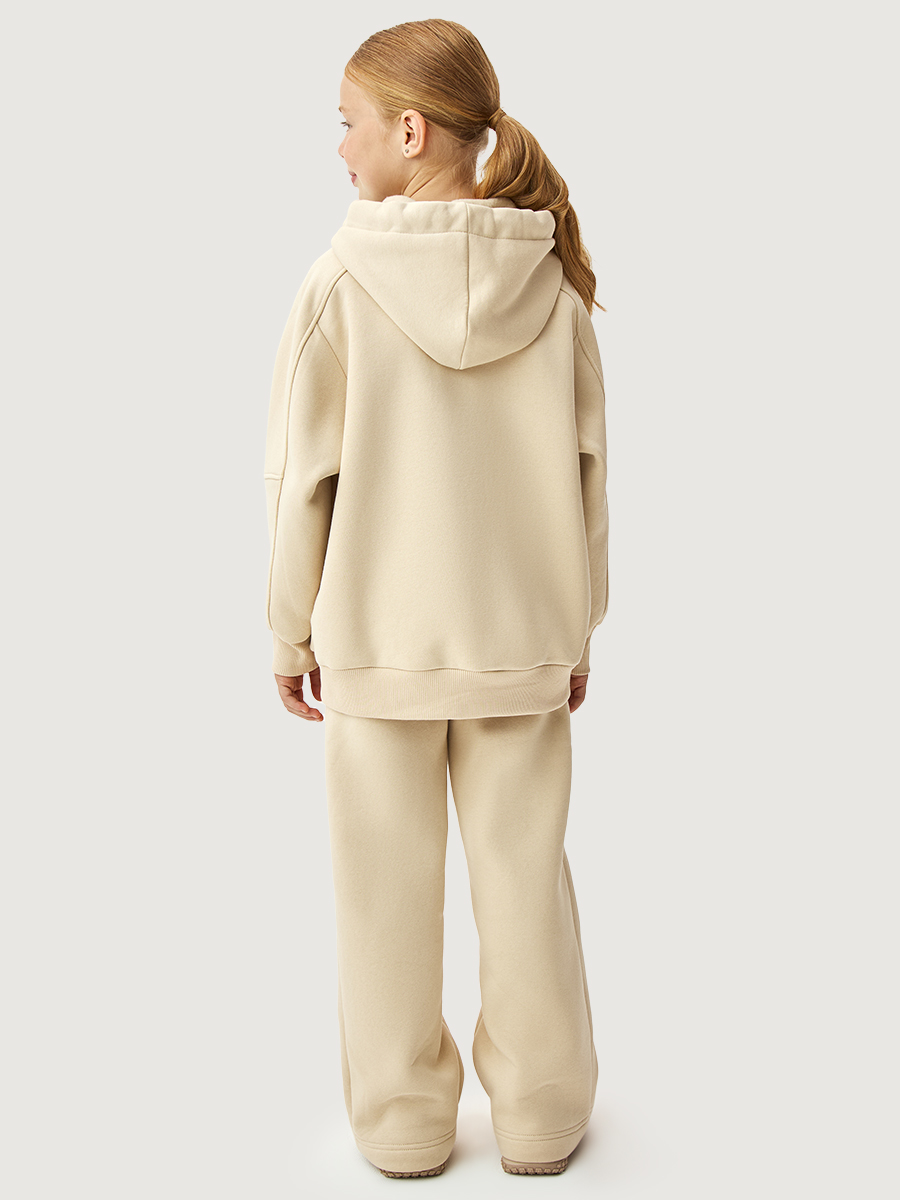 Костюм МИЛК-ШЕЙК из плотного хлопкового трикотажа с мягким стриженным начесом внутри. Состоит двух предметов — худи и брюк. Худи свободного силуэта, с объемным капюшоном, карманами. Манжеты и пояс из трикотажного полотна «кашкорсе».