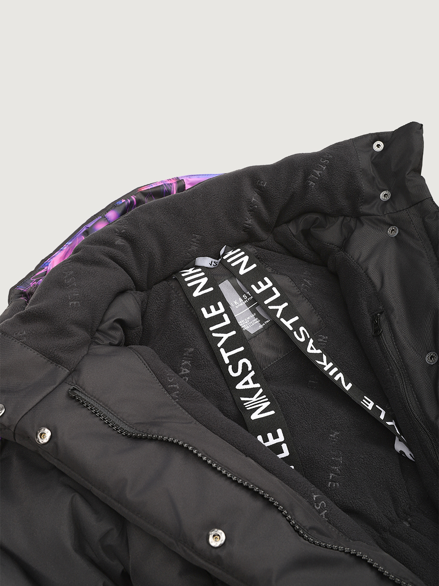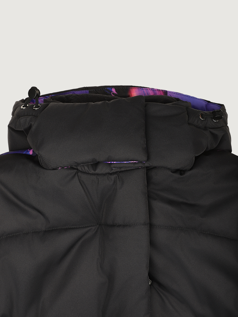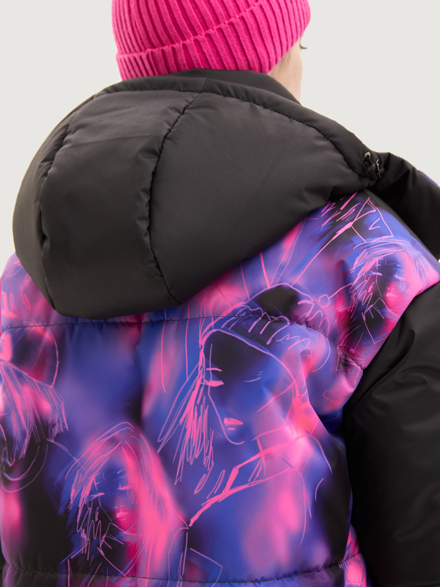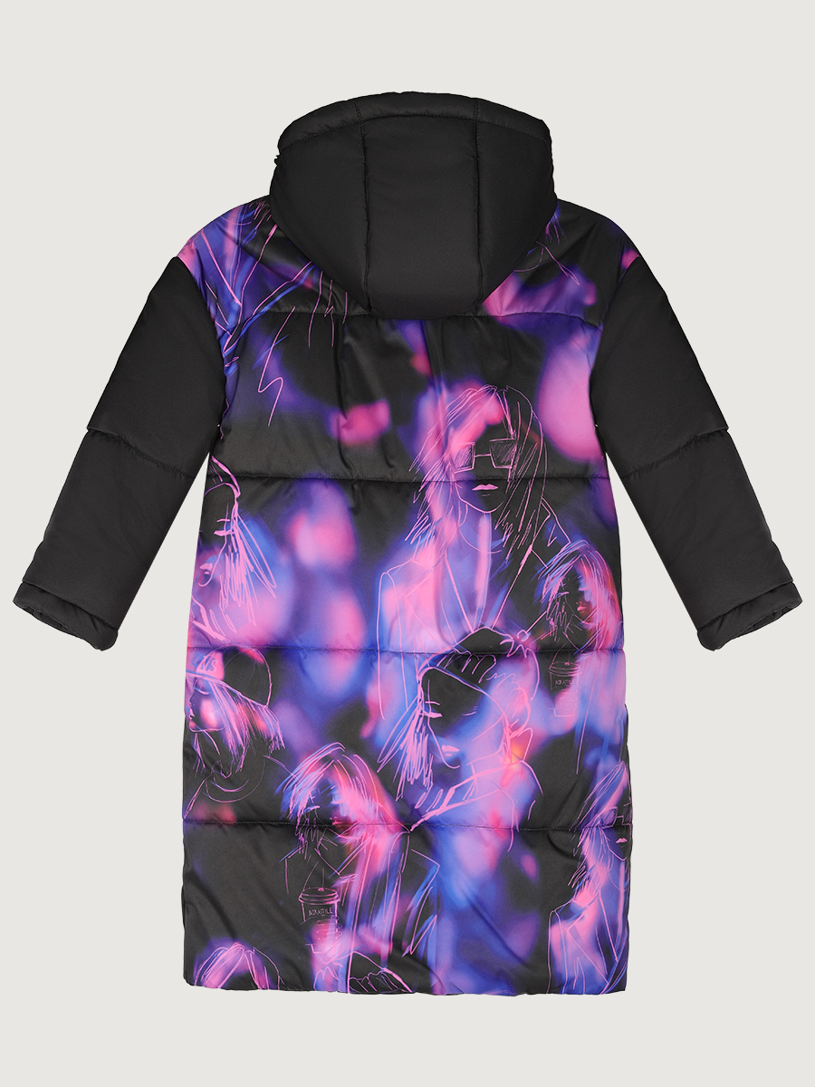 Стеганое уютное пальто-одеяло ЛАЙТ с эксклюзивным ярким принтом на спине, с удобной застежкой на магнитные кнопки. Пальто из мембранной ткани 5000/5000 с водо- грязеотталкивающей технологией TEFLON.