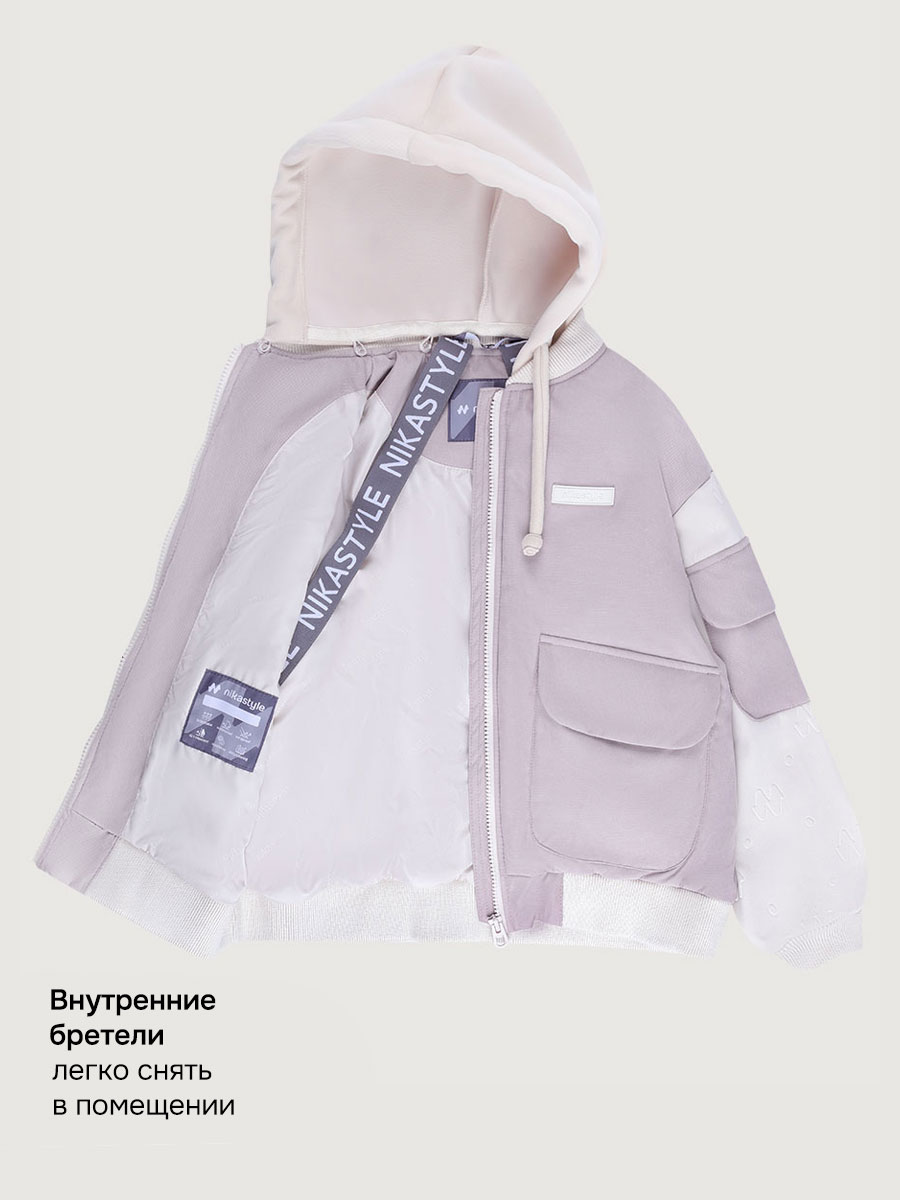 Мы все продумали до мелочей: манжет, горловина, низ оформлены трикотажным подвязом, съемный капюшон из футера, внутренние бретели для возможности снять куртку в помещении.