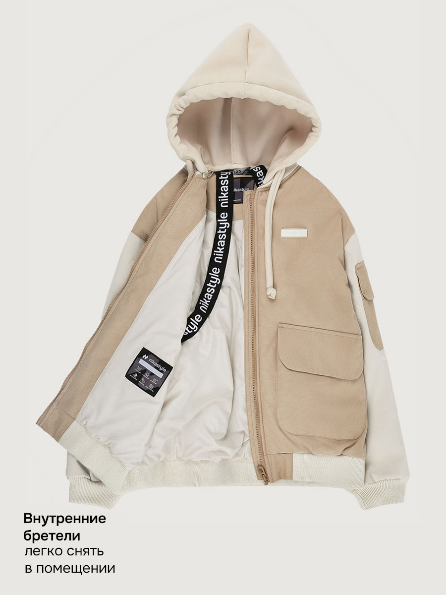 Мы все продумали до мелочей: манжет, горловина, низ оформлены трикотажным подвязом, съемный капюшон из футера, внутренние бретели для возможности снять куртку в помещении.