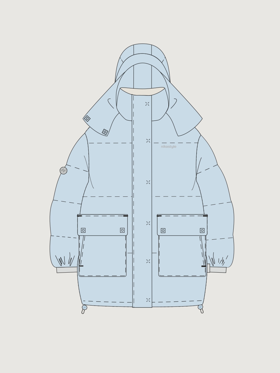 Функционал: центральная застежка на молнии, внутренний карман на молнии, накладные карманы с двойным входом с клапанами на магнитных кнопках, ветрозащитная планка на кнопках, съемный капюшон на молнии, кулиса для регулировки объема по капюшону и по низу куртки, эластичная резинка по низу рукава.