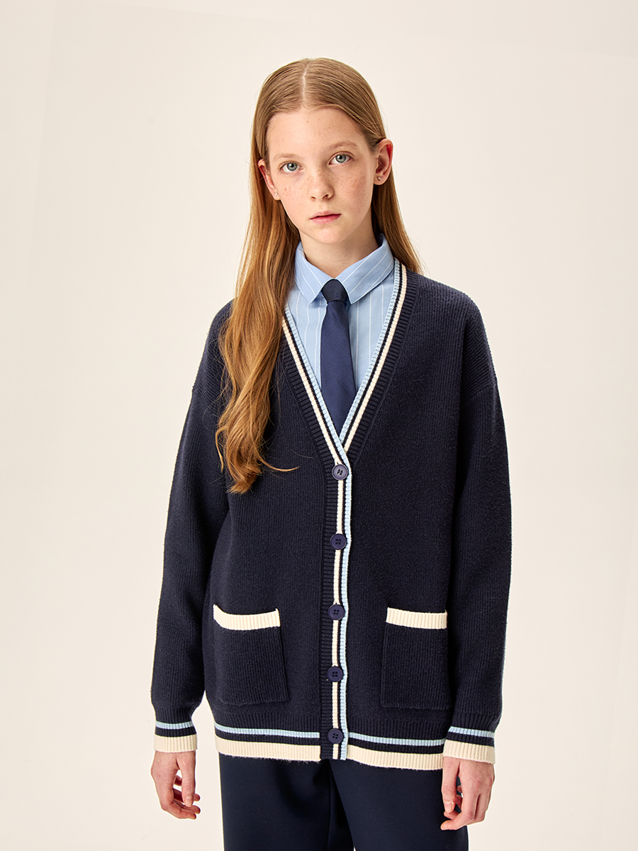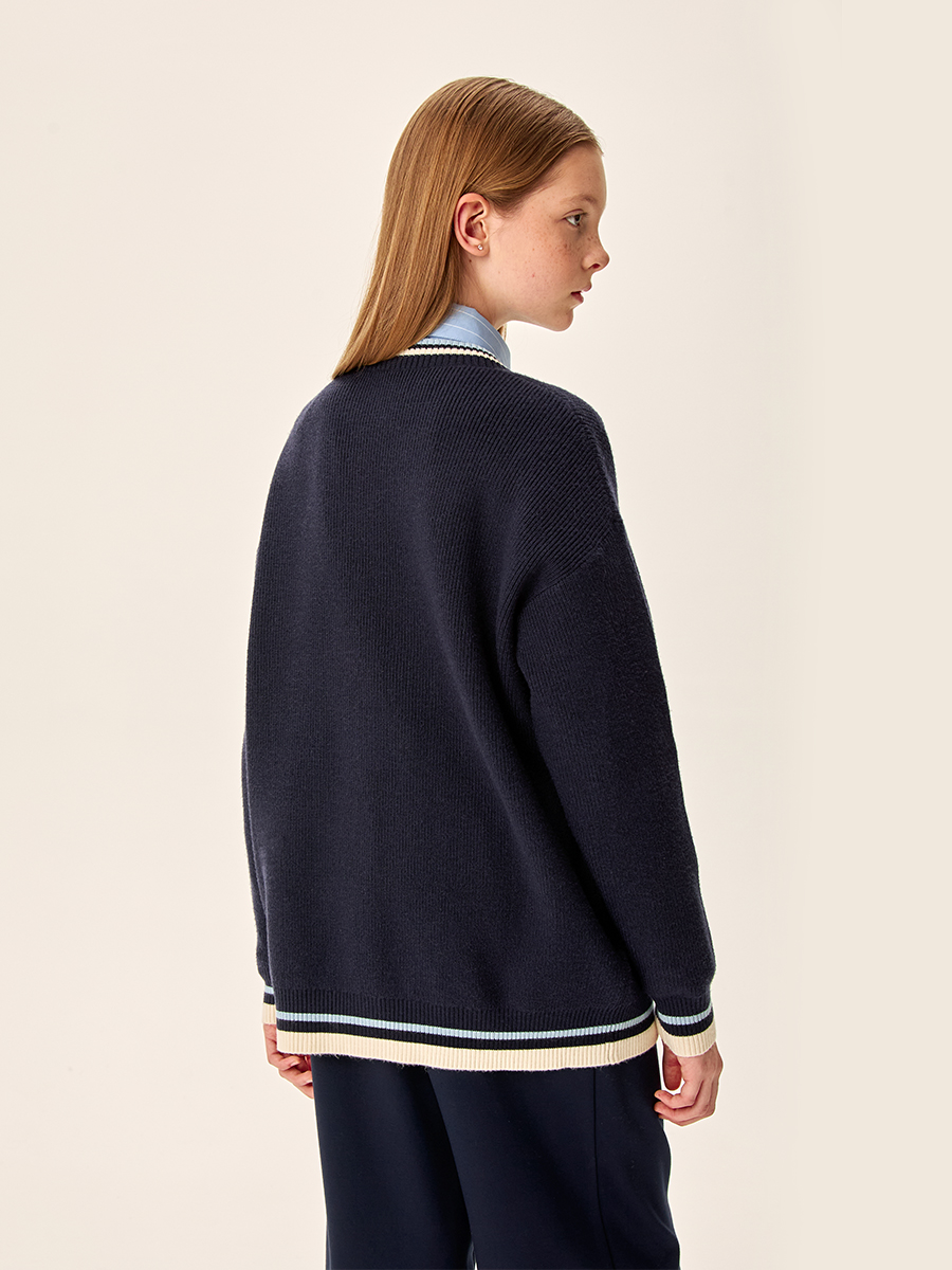 Вырез горловины V-образный. Контрастные полоски - окантовка по краю кофты и на манжетах придают изюминку.