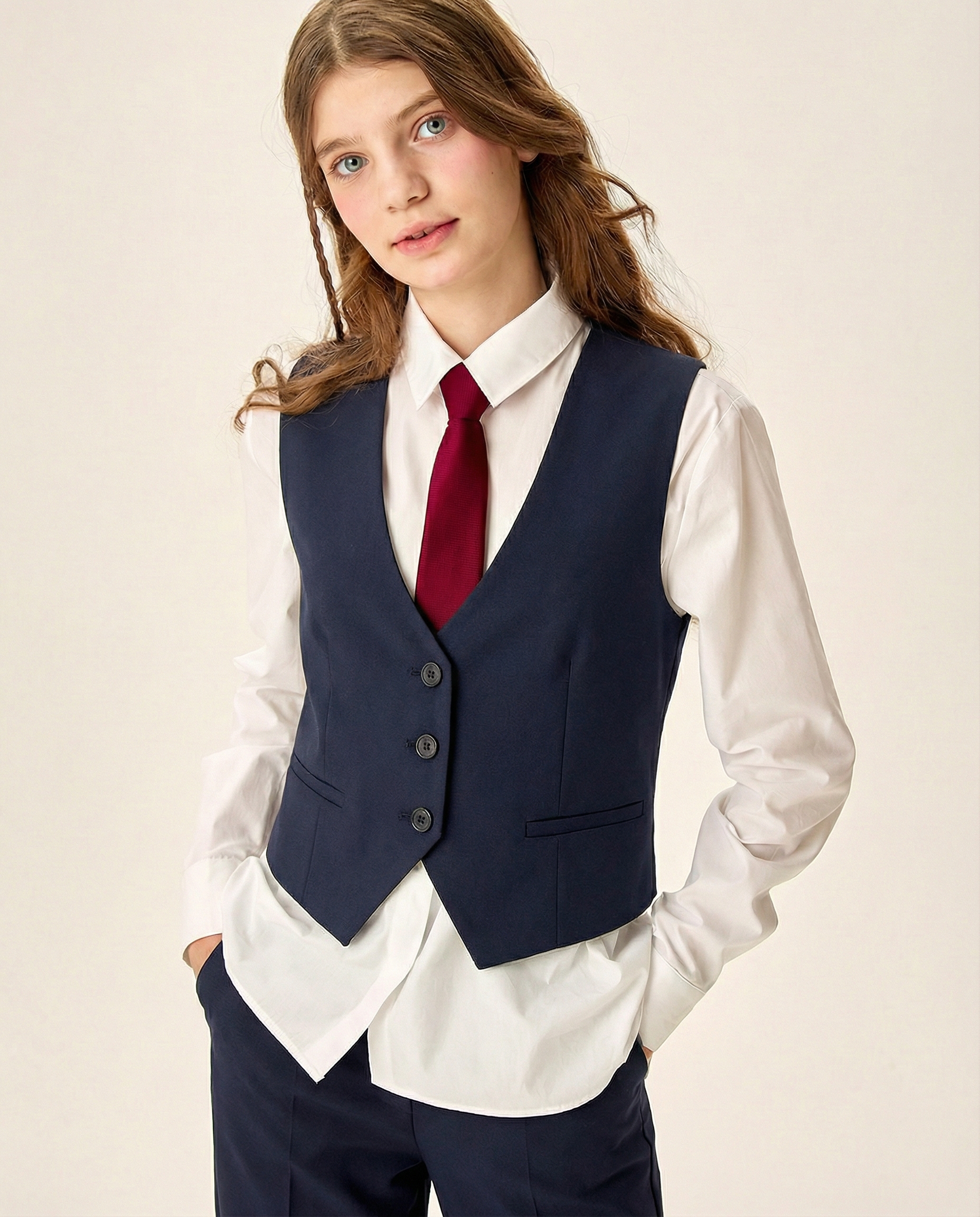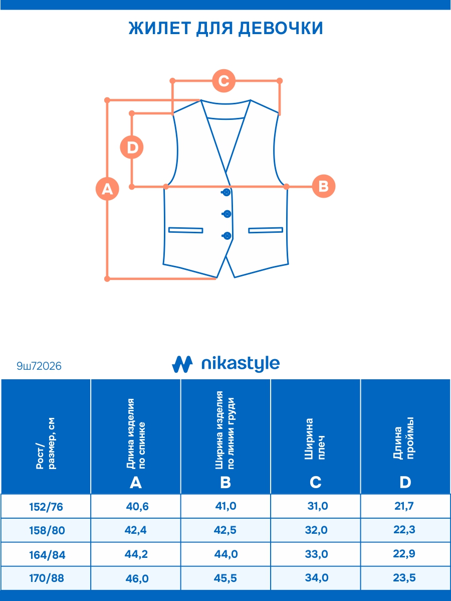Жилет для девочки из прочной, качественной костюмной ткани с содержанием вискозы и добавлением эластана не мнется и обеспечивает удобство при носке.
