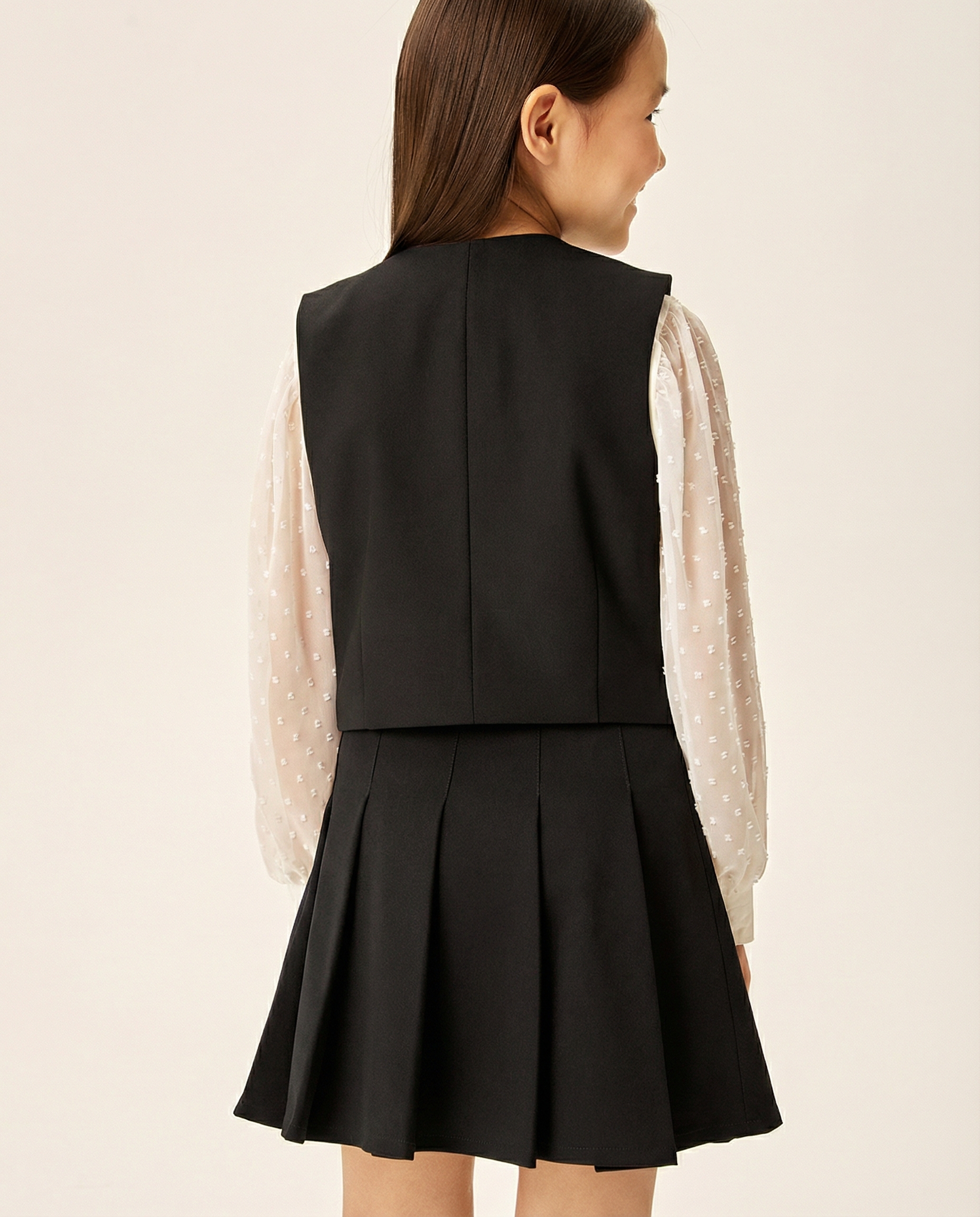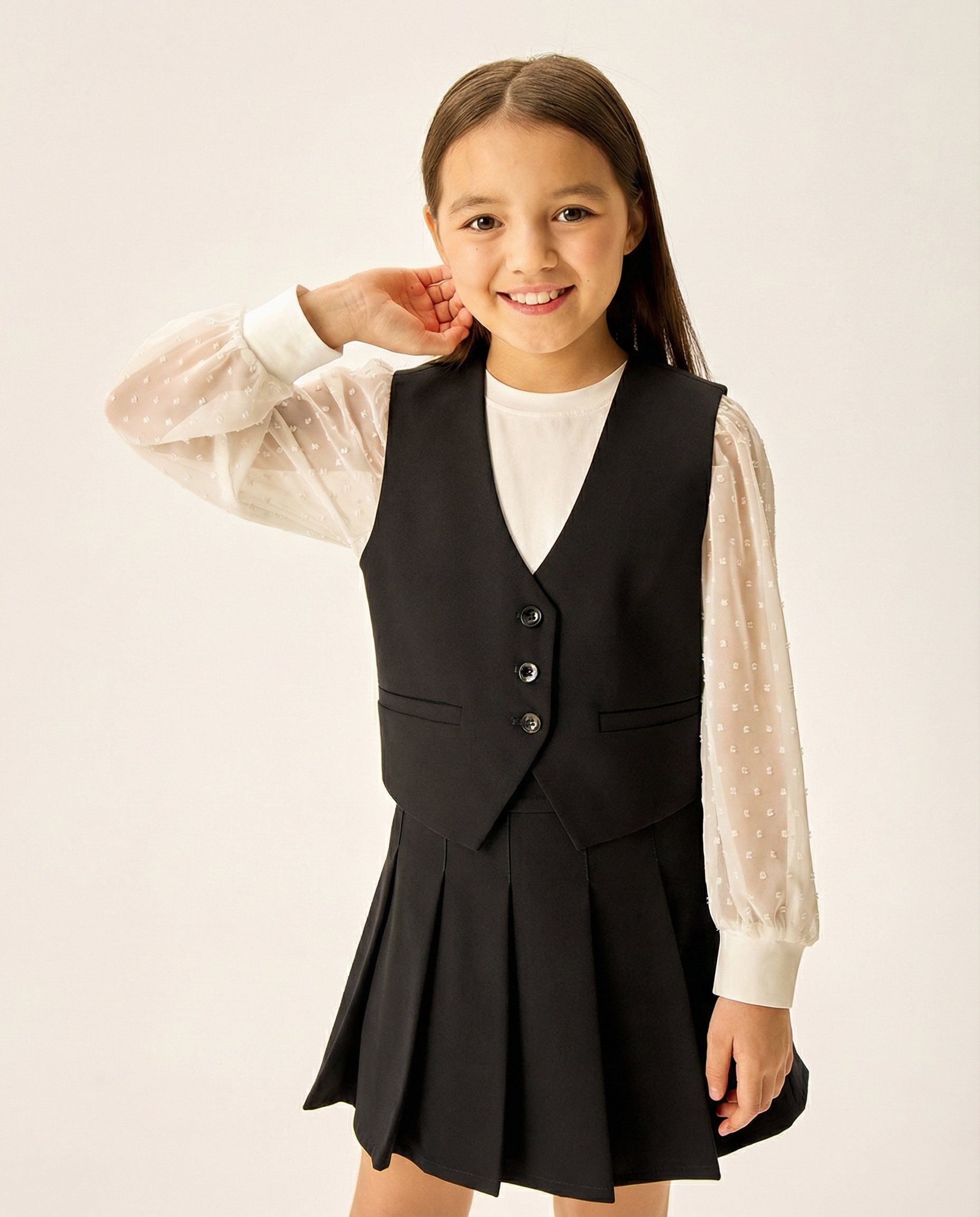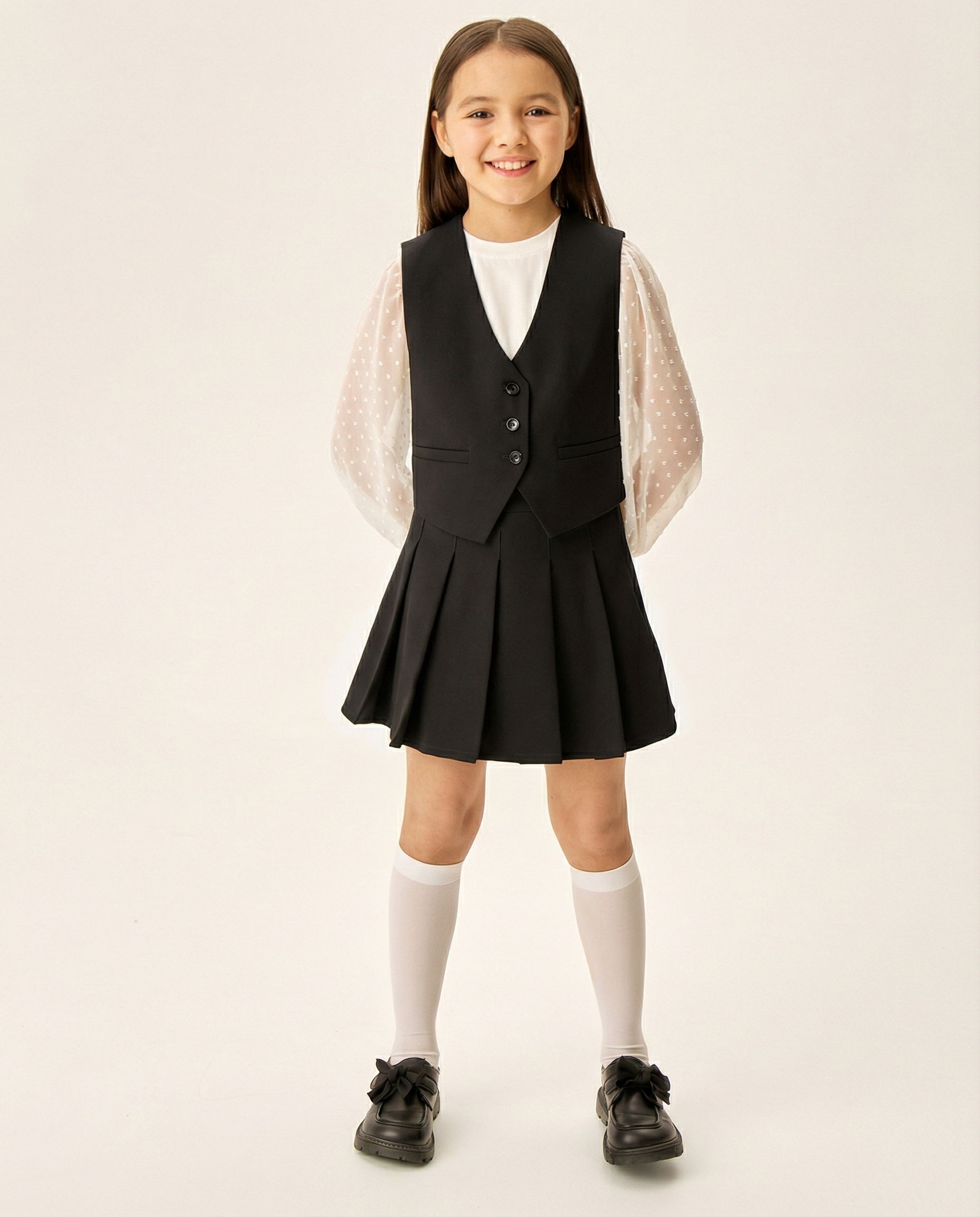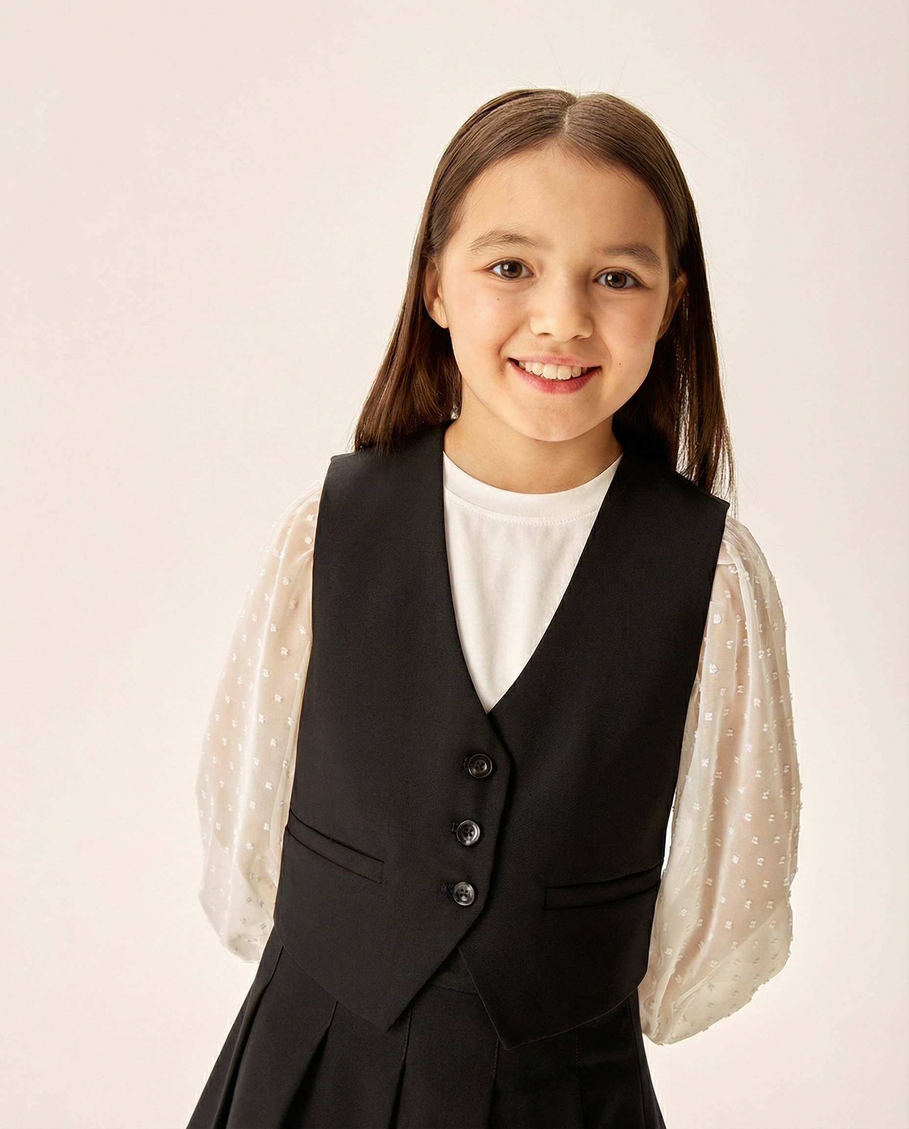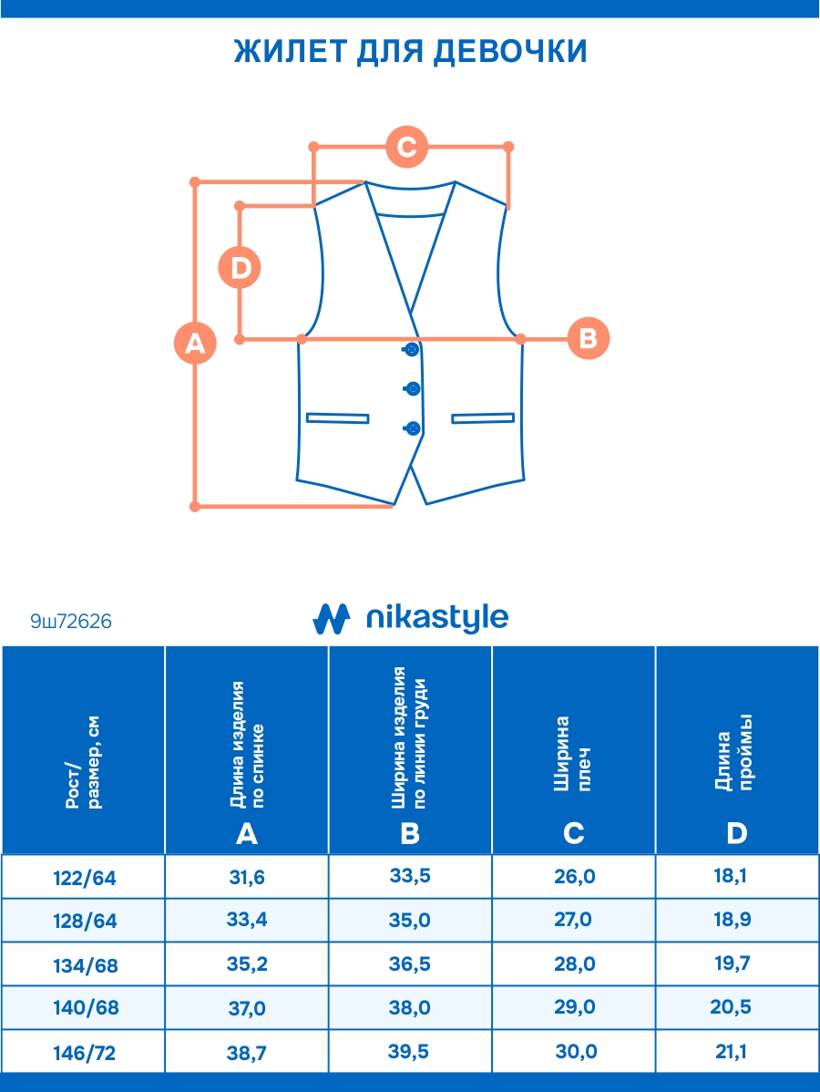 Жилет для девочки из прочной, качественной костюмной ткани с содержанием вискозы не мнется и обеспечивает удобство при носке.