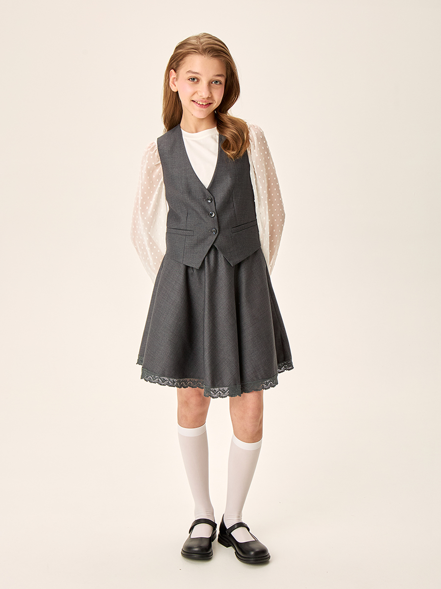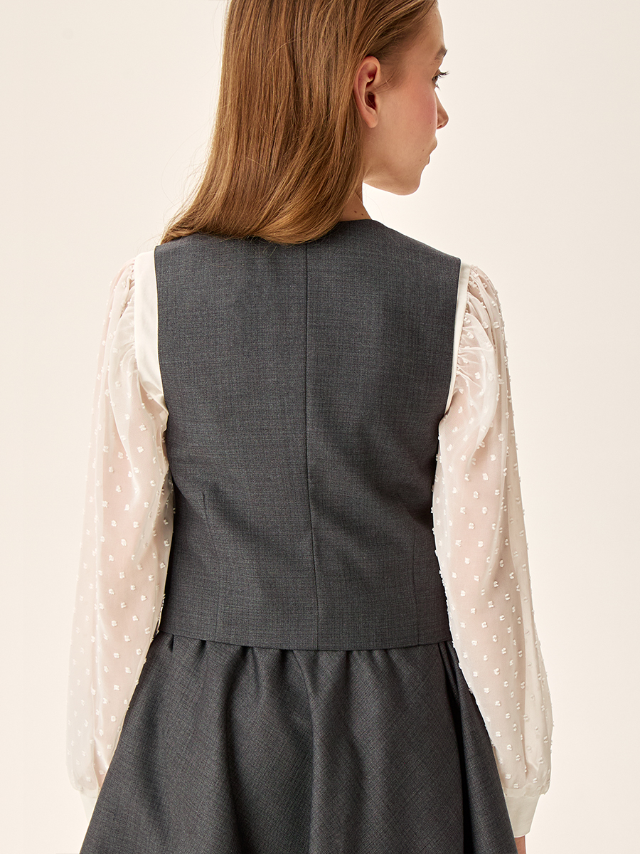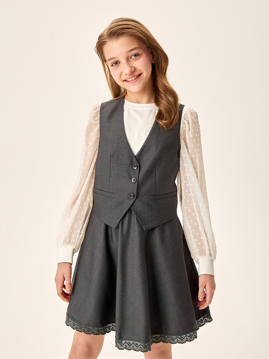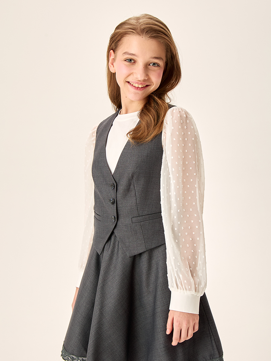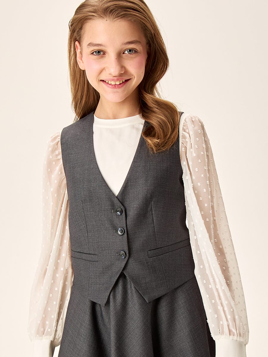 Жилет для девочки из прочной, качественной костюмной ткани с содержанием вискозы не мнется и обеспечивает удобство при носке.
