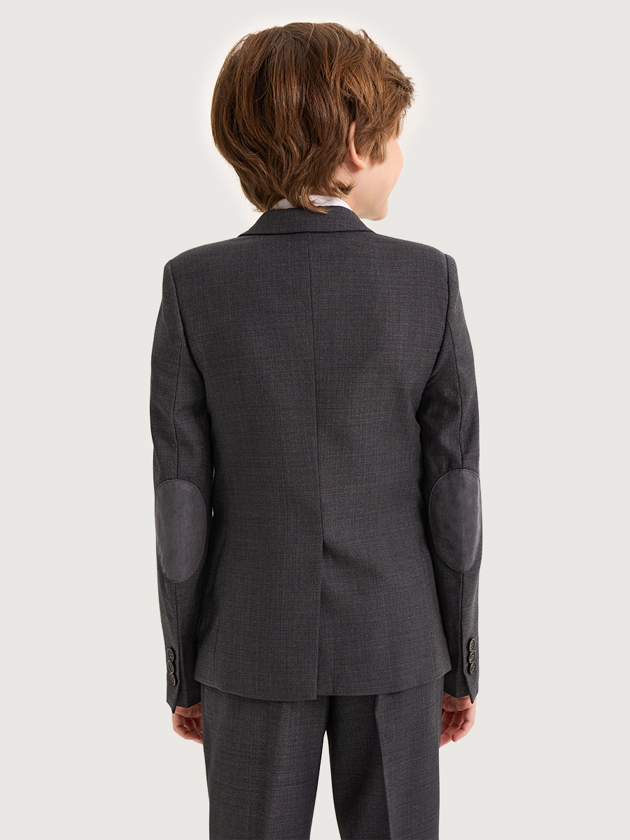 Пиджак с налокотниками и деталями из отделочной ткани – идеальное решение для мальчика, который ценит комфорт и стиль. Прочная, качественная костюмная ткань с содержанием вискозы не мнется и обеспечивает удобство при носке. Пиджак имеет треугольный вырез и отложной воротник с лацканами, которые придают ему строгий и элегантный вид. Полуприлегающий силуэт с вытачками обеспечивает идеальную посадку по фигуре ребенка.