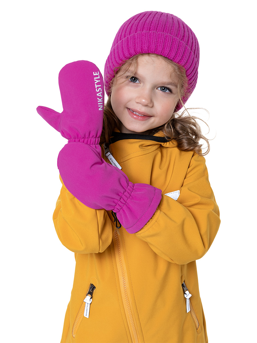 Варежки из Softshell с резинкой на запястье. Softshell - это инновационный материал нового поколения, внешний слой которого защищает от влаги, внутренний слой из флиса сохраняет тепло и отводит лишнюю влагу, а промежуточный мембранный слой имеет хорошую паропроницаемость и позволяет коже дышать. Softshell приятный на ощупь, легкий и эластичный материал, не сковывающий движения ребенка.